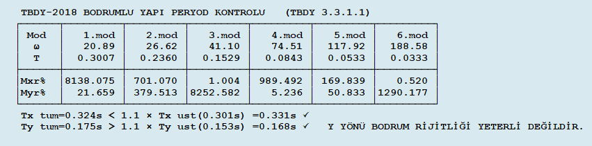 Hocam iyi günler dilerim lütfen bir sorum olacaktı kusuruma bakmayın daha yeni yeni programı öğrenmeye başladığım için belkide acemice bir soru olacaktır.Yukarıdada attığım deprem raporu görselinin kesitinde yönetmeliğe göre deprem devrilme momenti oranı asmolen yapılarda x ve y yönlerindeki perdelerde 0.40 ile 0.75 oranları arasında olacaktır deniliyor .Bu duruma göre analizini yaptığım yukarıdaki asmolen yapıda x yönü için 0.28 y yönü için ise 0.83 deniliyor Bu kısıma mı bakacağız yada Mdev/Mo =0.28 deniliyor bu kısım mı kontrol edilmelidir.Ayrıca 0.28 oranı bizim için yapının yapının devrilme momentinin kontrol edildiği kısım ise 0.28<0.4, olduğu için alınabilecek önlere değinirseniz sevinirim.Şimdiden teşekkürler.