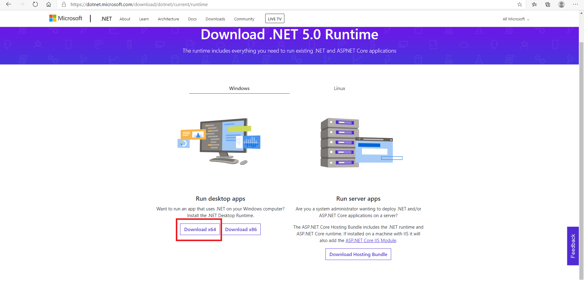 2)Net 5.0 altyapısını geçilmiştir. Program açıldığında kurulum için sizi yönlendirecektir. Açılan sayfada ekteki resimdeki x64 kurulumunu indirebilirsiniz.