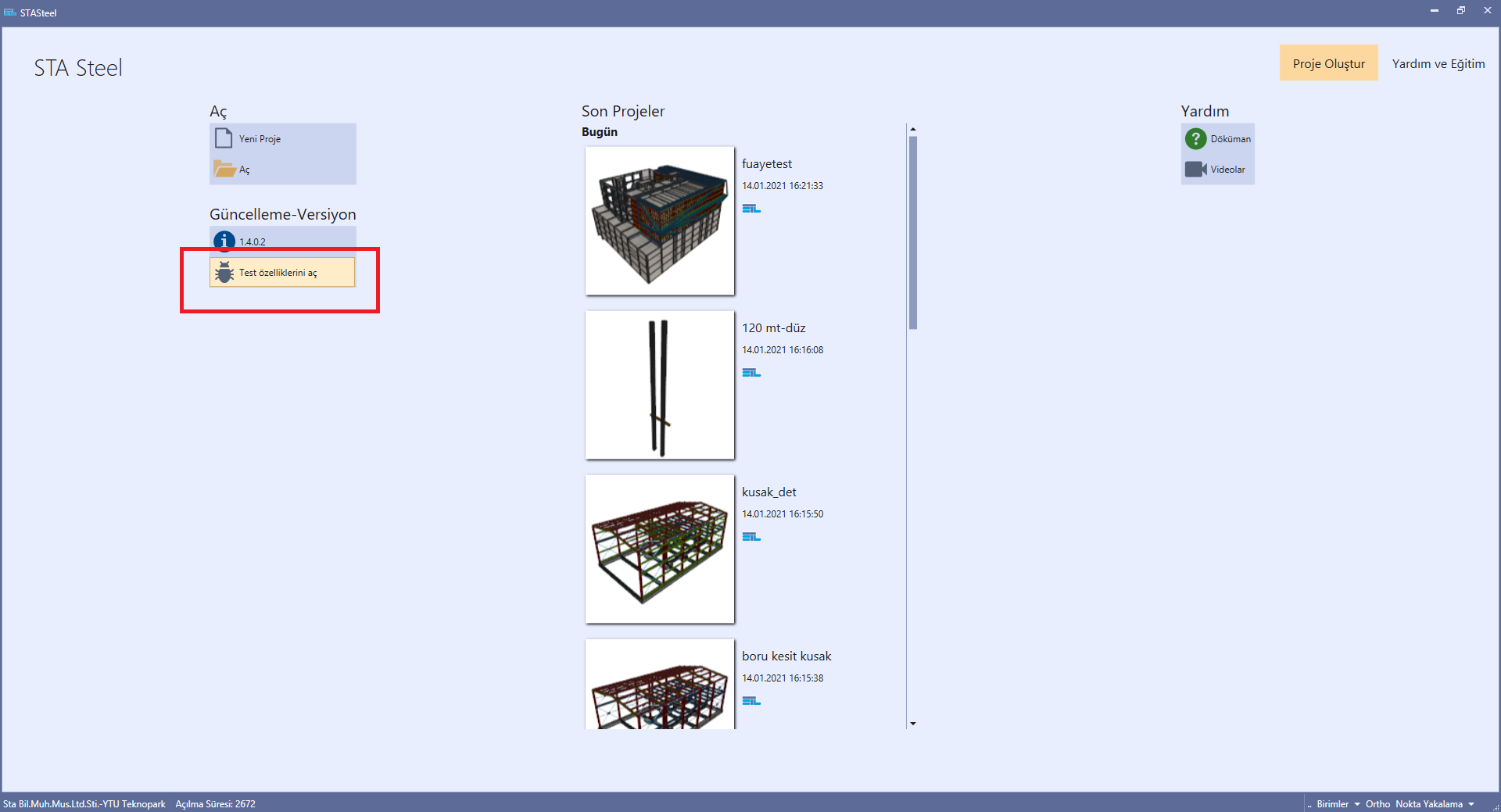 11)Program açılında isteyen kullanıcılar için test özelliklerini açma kısmı eklenmiştir. Şuan için test özelliği olarak şuan için test çizim kısmını kullanabilirler. Genel yerleşim ve birleşim çizimi gibi kısımlar iyi durumdadır ancak parça ve assemly çizimi şuan çok kötü durumdadır. Bu kısımın çizimlerinde atma ve hatalar olabilir. Ancak ilerleyen zamanlarda tamamen düzenlenebilir ve müdahaleye açık şekilde geliştirilecektir. Şuan için kesit 3d gibi genel yerleşim çizimlerinde grafik filtreler dahil şekilde çizimde kullanabilirsiniz.