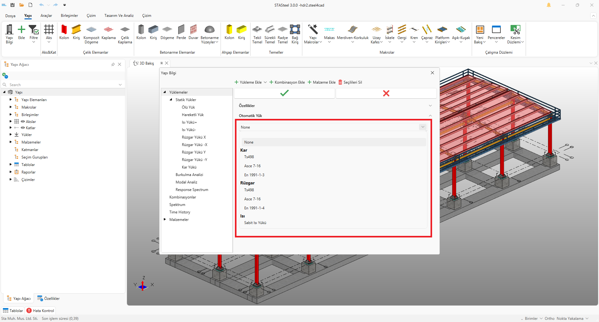 Asce ve TS en  rüzgar ve kar yükleri ve bunun dışında bir çok çalıştığımız konu var. Bu kısımla ilgili baya ilerlemiş durumdayız genel ayarlar dışında kullanıcı kendi oluşturduğu bir yüklemede isterse otomatik yüklerden birini seçebilecek.