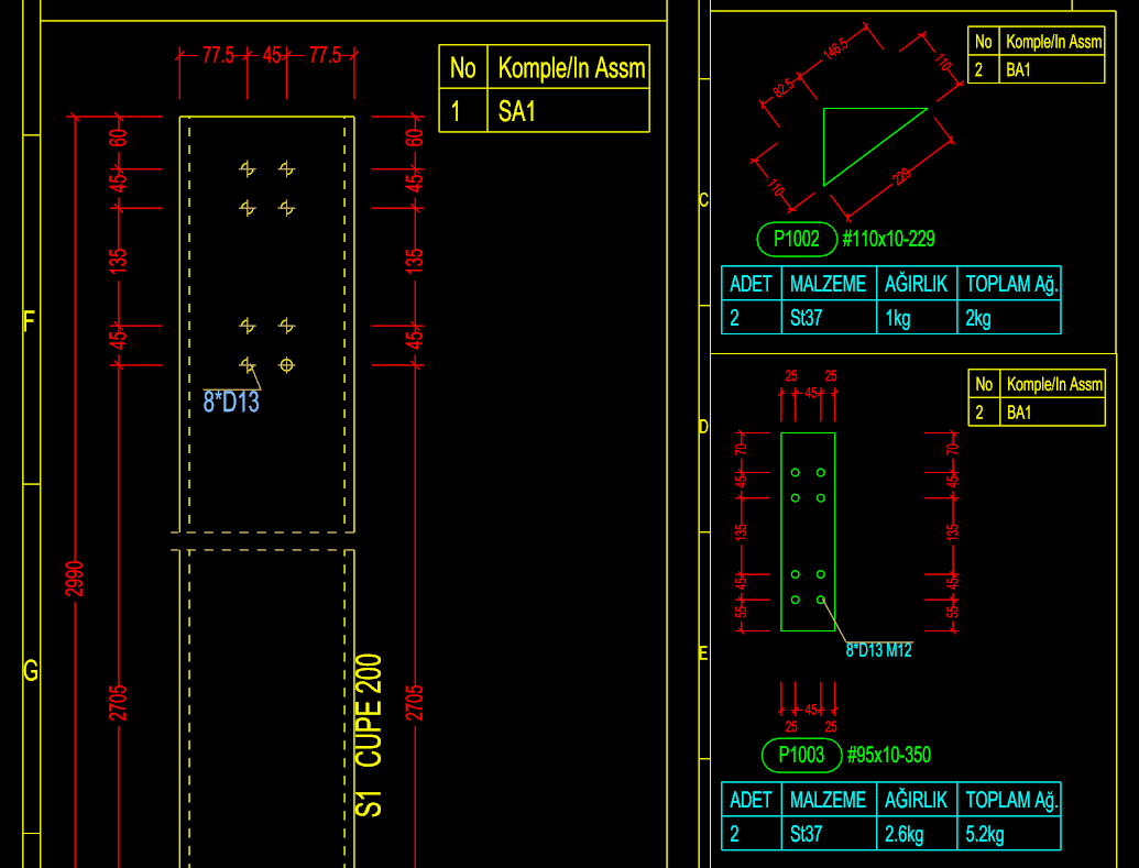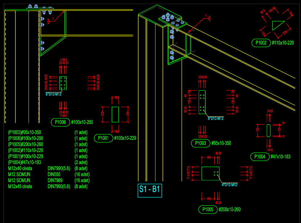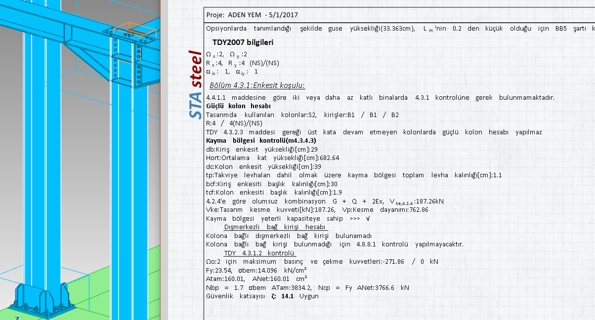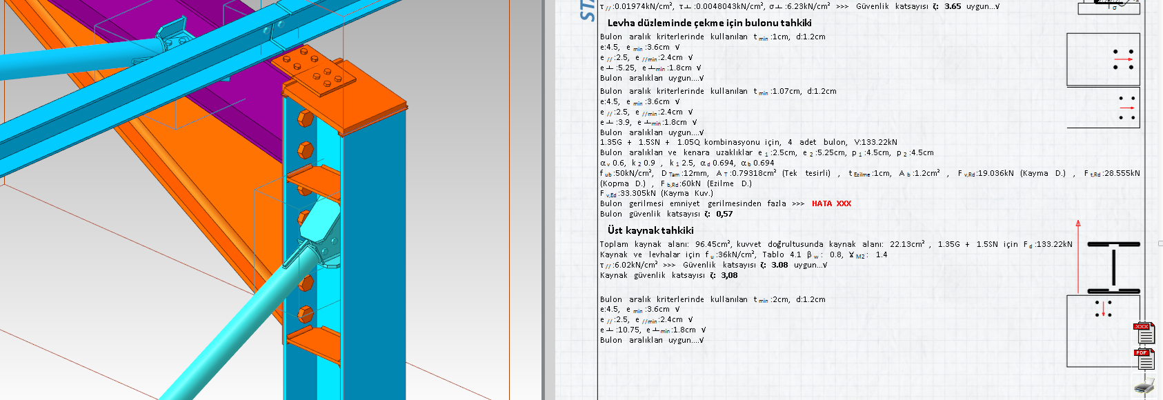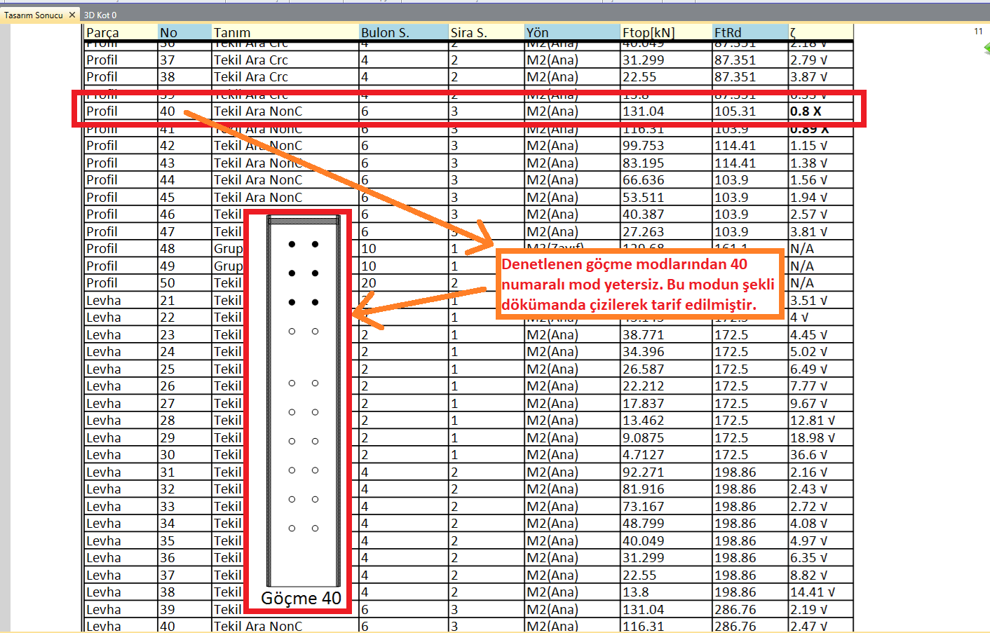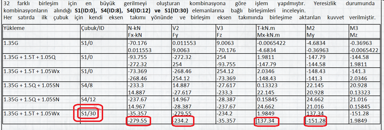Örneğin bu temel ayağında, 30 ID numaralı S1 kolonu altında bulunan birleşim kritik durumdadır. Sadece bu birleşim detayı değiştirilebilir(ankraj adedi, plaka kalınlığı vs..) veya üretim kolaylığı açısından bütün temel ayakları değiştirilebilir. Burada dikkat edilmesi gereken husus, üstüne tıklanıp bakılan birleşime değil raporda verilen birleşime bakılması gerekliliğidir.