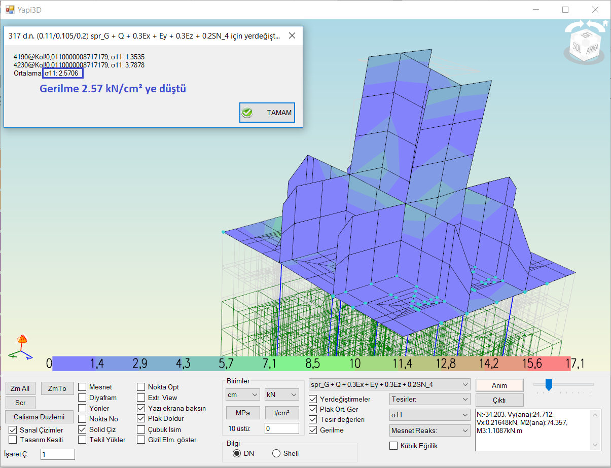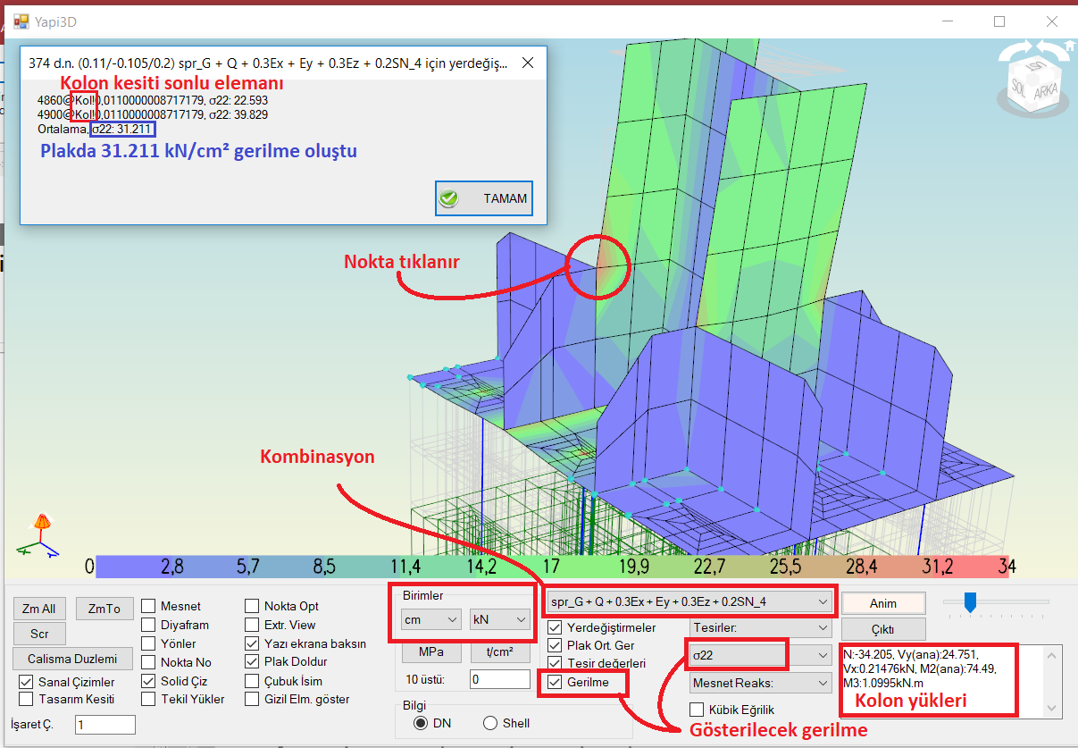 gerilmeleri özel kabuk/solid elemanları ile elde eder. Bu işlemler çözümlerde uzun vakit aldığı için, maksimum gerilmeyi ortaya çıkartacak birkaç kombinasyon bütün temel ayaklarında kullanılır. Sistemin kurtarmaması durumunda hangi birleşimin kurtarmadığı çıktılarda belirtilir: