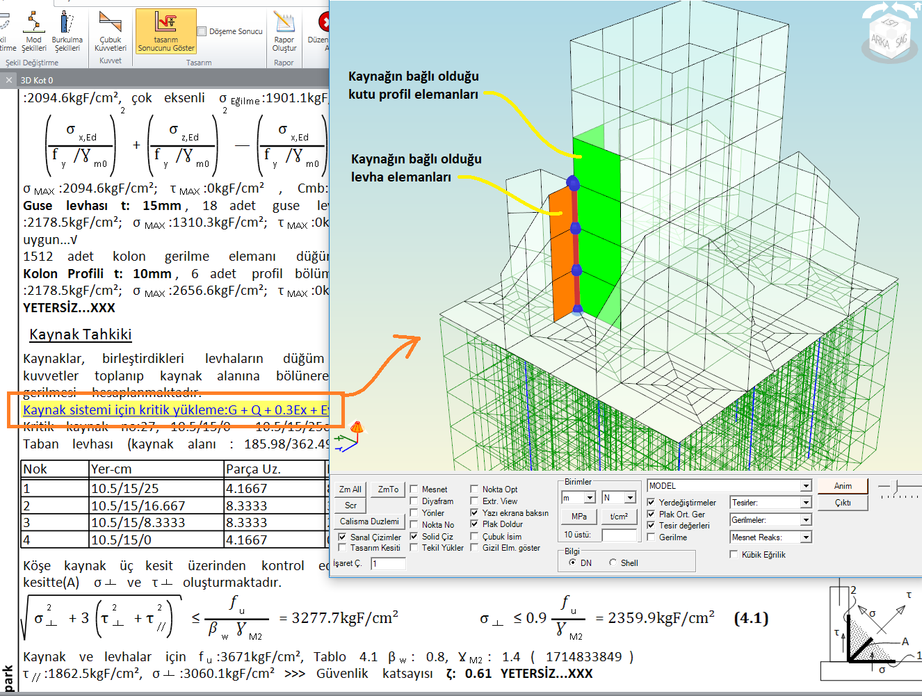 birleşimde sadece kolona ait noktalarda gerilmenin aşıldığı görülmektedir. Bunun nedeni, levha kalınlığı gereği kadar artırılabilirken kolon et kalınlığı seçilen profil ile sınırlıdır. Bu durumda, ya kolon profili büyütülecek veya kolon profilinin kontrolü zaten kolon hesaplarında yapıldığı için, opsiyonlardan temel birleşiminde kolon kontrolü kaldırılacaktır.