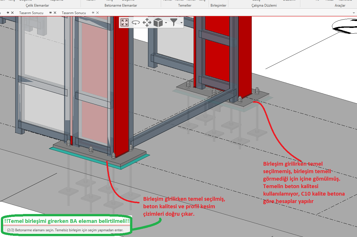 Birleşim tanımlanırken, çelik kolonlar seçildikten sonra "ENTER" tuşuna basıldığında, program kolonların oturacağı BA elemanın seçilmesini bekler. Eğer BA eleman seçilmeden tekrar "ENTER"a basılırsa, program profil kesimlerinde BA elemanı kullanmaz, ayrıca hesaplarda BA elemanın beton kalitesini kullanmaz.