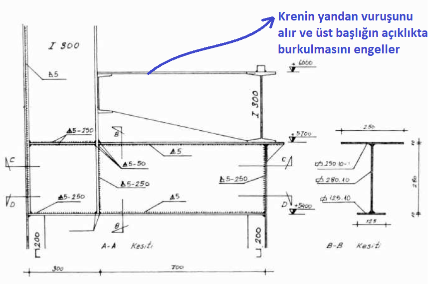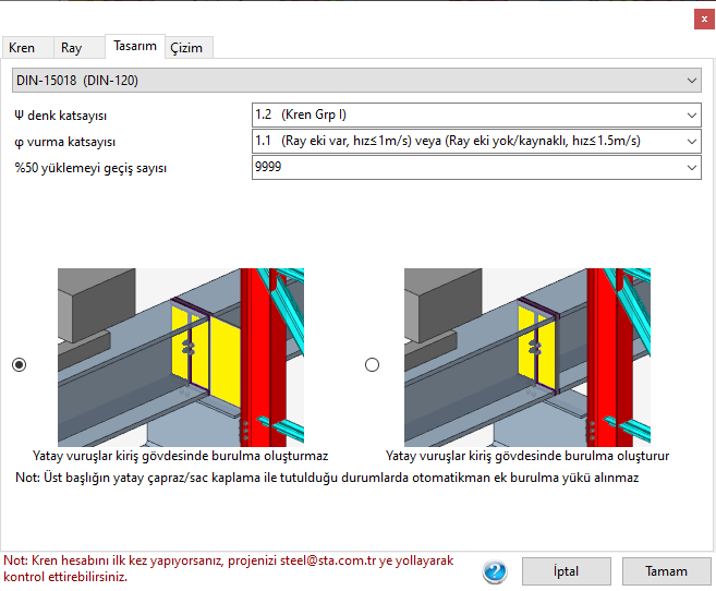 Seçilen birleşimde, kren kirişi başlığı kolona bağlanacaksa raya dik yatay yükler başlık üzerinden direk kolona aktarılacağı için profil ekseninde burulma ortaya çıkartmayacağı düşünülebilir. Eğer böyle bir birleşim yoksa, kirişe başlık hizasından yandan tutulacağı alt noktaya kadar program otomatik olarak "EK BURULMA" yükü yükleyecektir. EK BURKULMA yükünün seçiminde, program kirişleri yandan tutan yüzey/makas/çubuk sistemi olup olmadığını da kontrol eder.