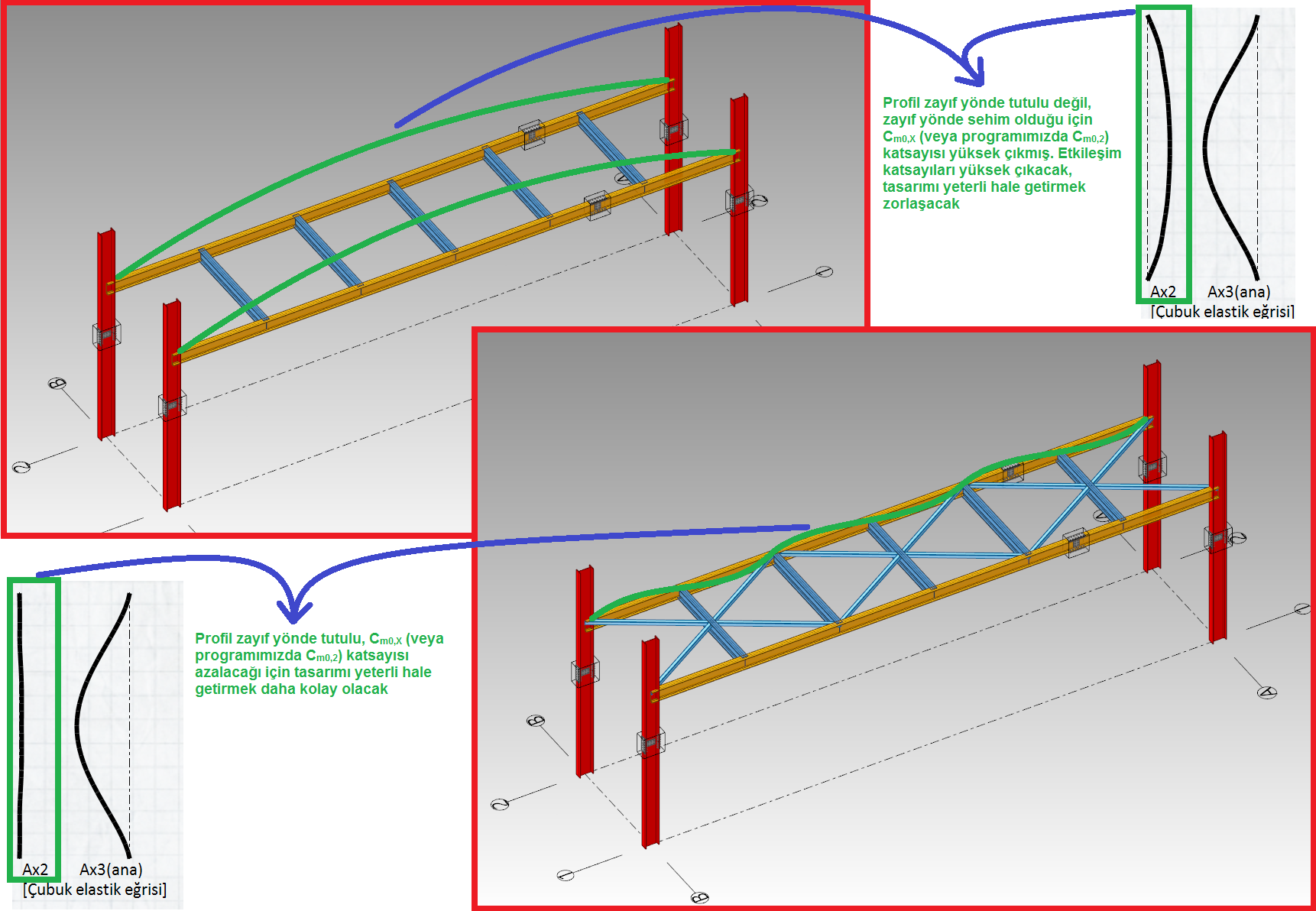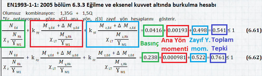 formülün temel olarak üç parçadan oluştuğu görülür. Yine görüldüğü gibi Zayıf yön momenti etkileri daha kritik durumdadır, çünkü profilin zayıf yön dayanımı daha azdır.