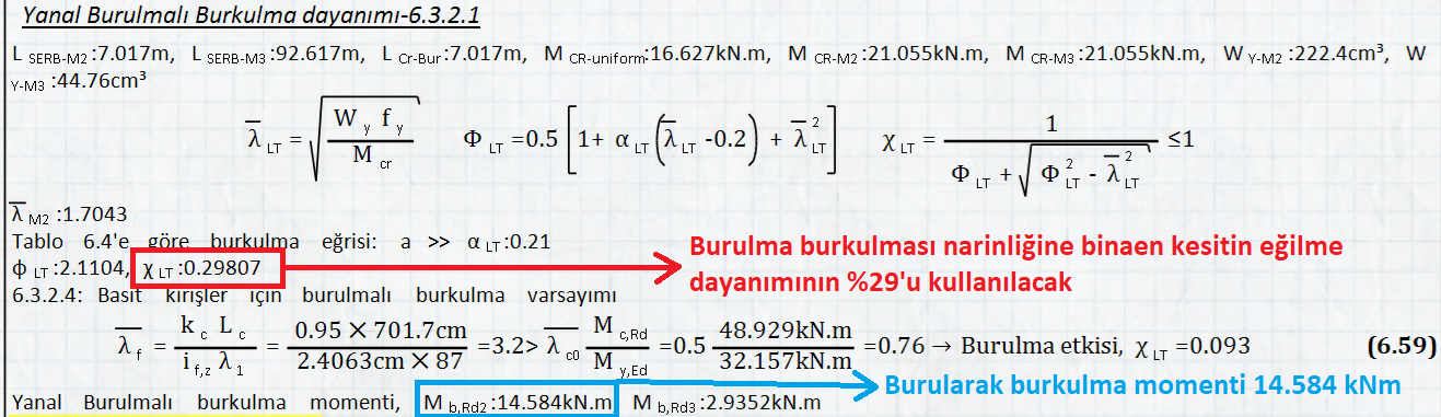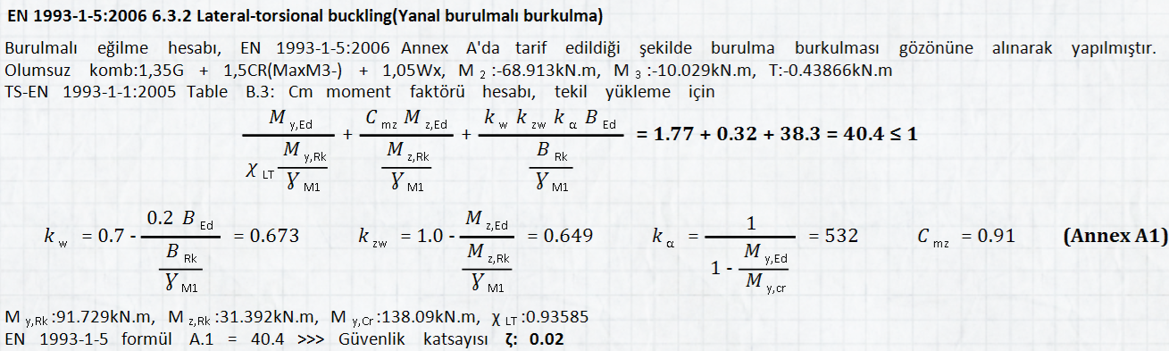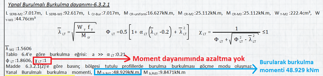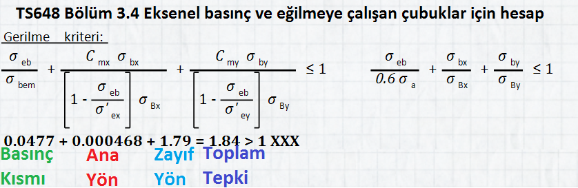 TS648'e bakıldığında, benzer şekilde gerilmeler üstünden karşılaştırma yapılmaktadır. TS648 elastik hesap yaptığı için, sadece zayıf yön momenti incelendiğinde bile profil yetersiz gözükmektedir. Bu hesap çok basitçe kontrol edilebilir, M/W=916 kN.cm/47,3cm3=19,36kN/cm2 lik gerilme elde edilir. Burkulma etkileri ihmal edilerek emniyet gerilmesi tamamen alınsa bile profil yetersiz durumdadır.