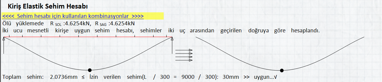 Görüldüğü gibi ana kirişin sehim kontrol noktaları, kesme kuvveti diagramından anlaşılabilmektedir. Bazı durumlarda neyin taşıyıcı neyin taşınan olduğuna mühendis bile karar veremez, yine en iyi sonuç kesme kuvveti diagramından alınmaktadır. Bu durumda programın verdiği sehim hesabı aşağıdaki gibidir: