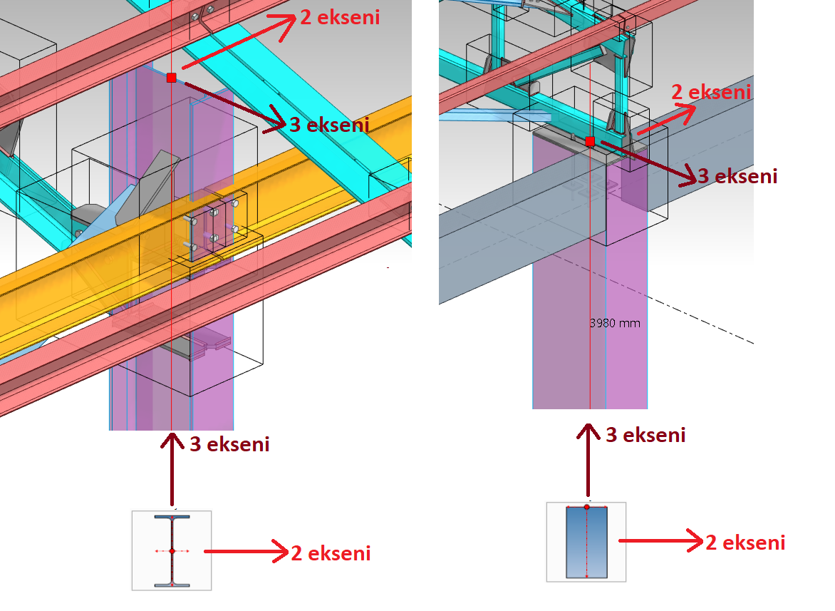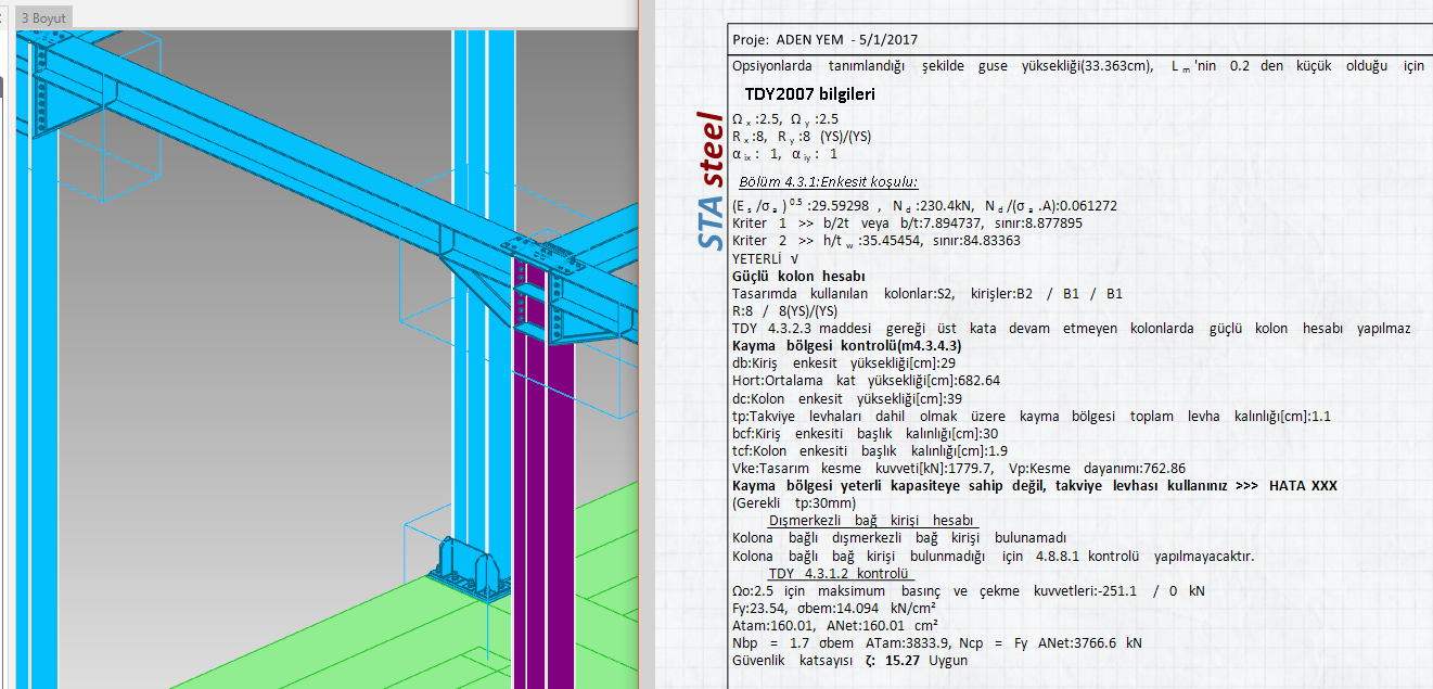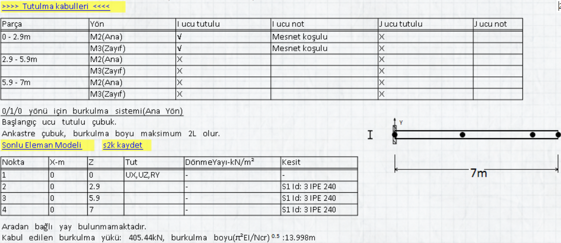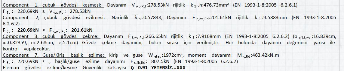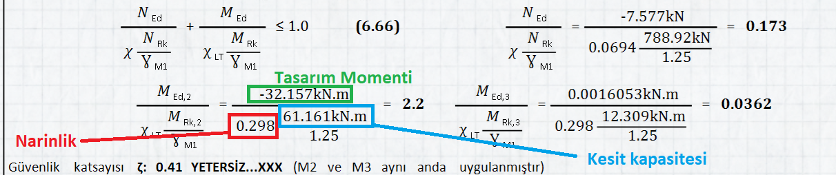 Bu hesap detayında 2 yönünde statik değerlerde, 3 yönünde minimum eksantrisitede olumsuzluk vardır. Fakat minimum eksantrisitenin etkisi kesit kapasitesinin 0.0692'si kadar olduğu için sorun teşkiletmemektedir. Statikten gelen moment kesit kapasitesinin 2.24 katı olduğu için statikle ilgili düzenleme yapmaya çalışacağız. Eğer bu mümkün değilse profil büyütülmelidir.