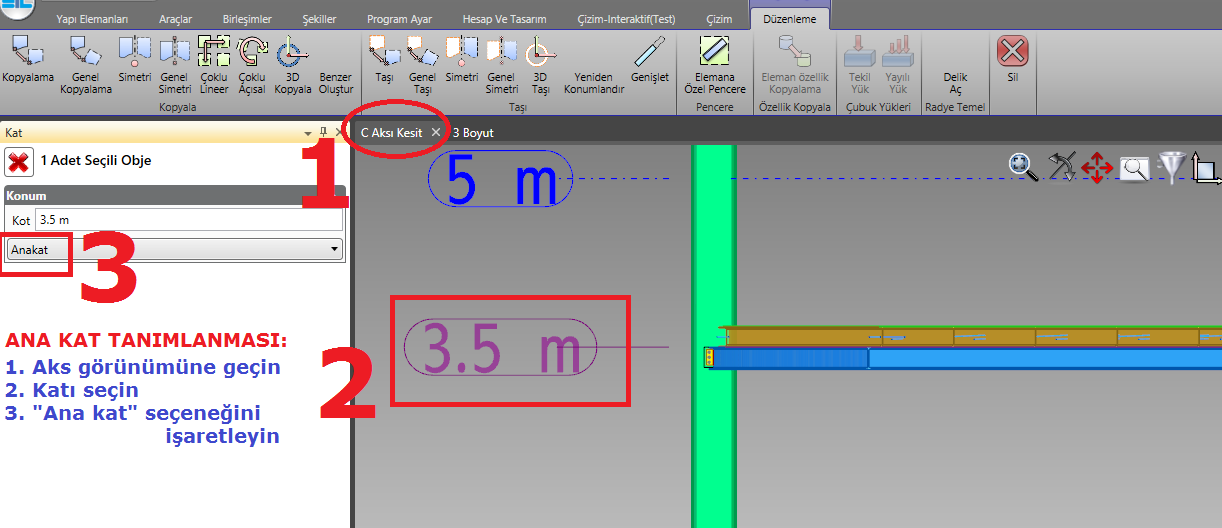 Sisteme herhangi bir aksdan bakılır, kat tanımı yapılacak ızgara seçilir ve ANA KAT tanımı yapılır. Yeni güncellemelerde "0" kotunu da ANA KAT olarak tanımlamalısınız