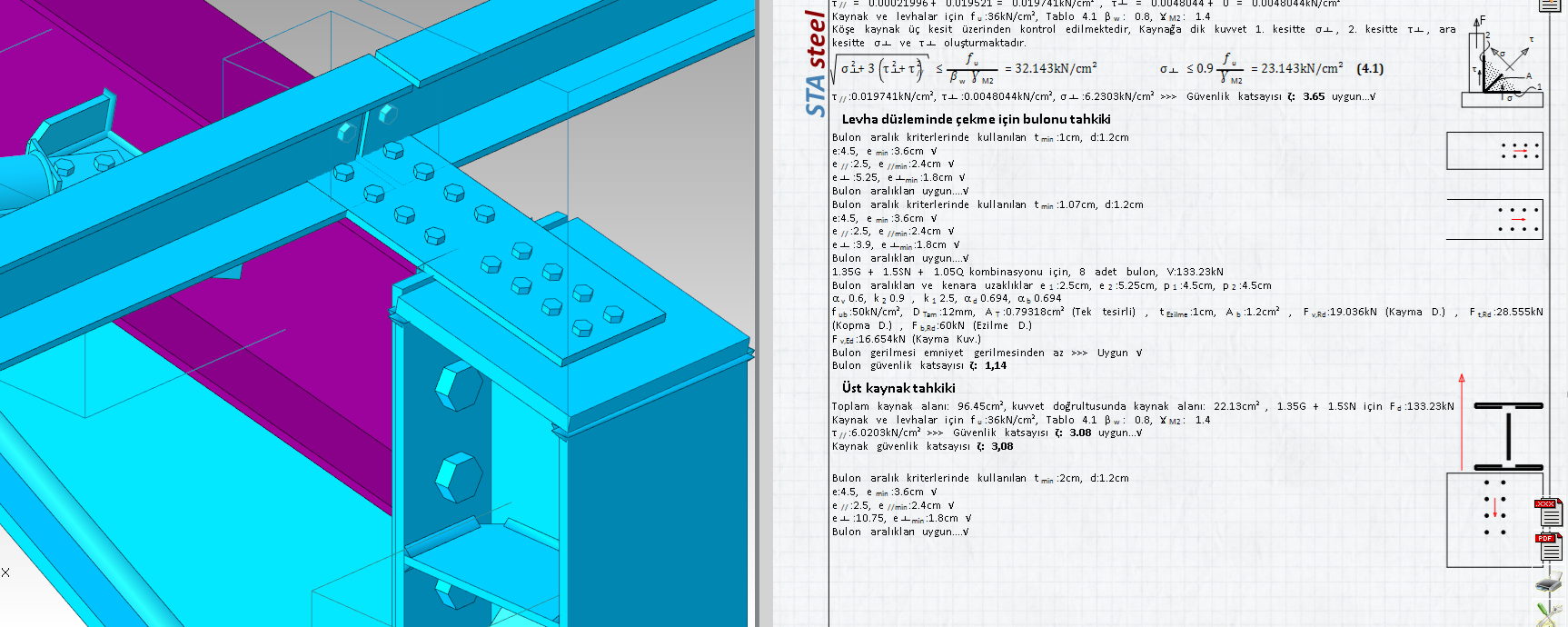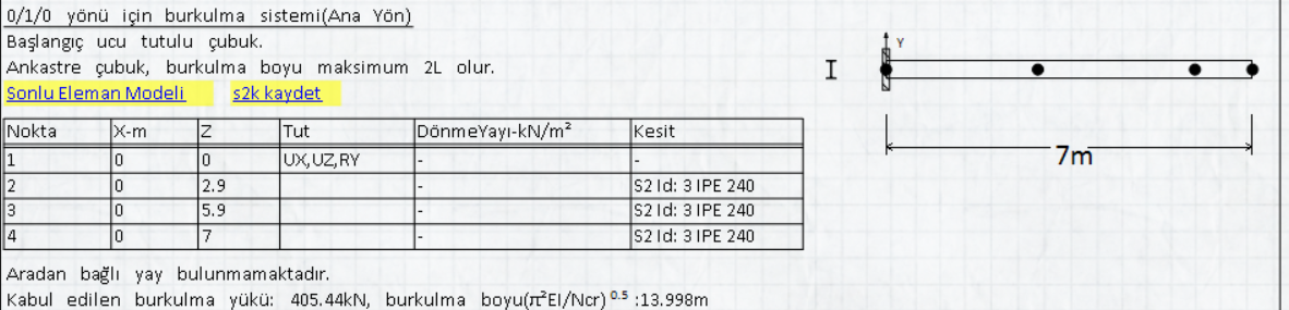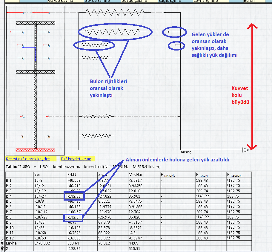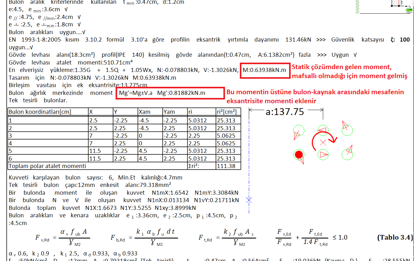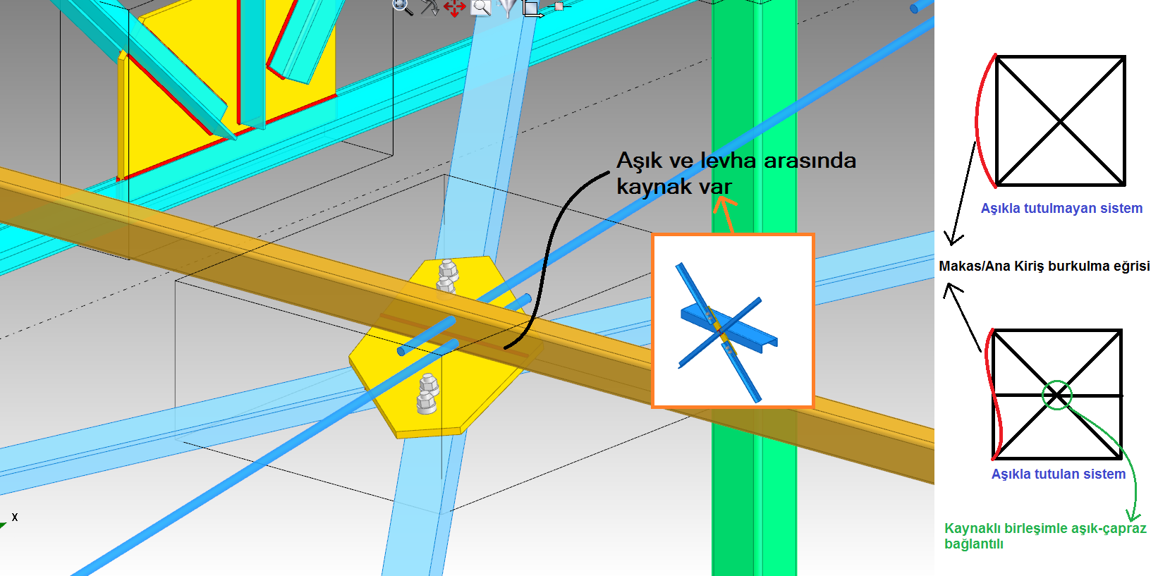 Sistemin ana kiriş ile bağlandığı noktaya biraz rijitlik verilir, çözümden sonra birleşimin kurtarıp kurtarmadığı kontrol edilir. Birleşim elemanları gelen momente göre kontrol edilmektedir:
