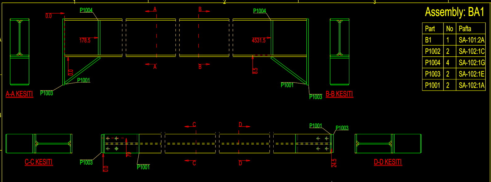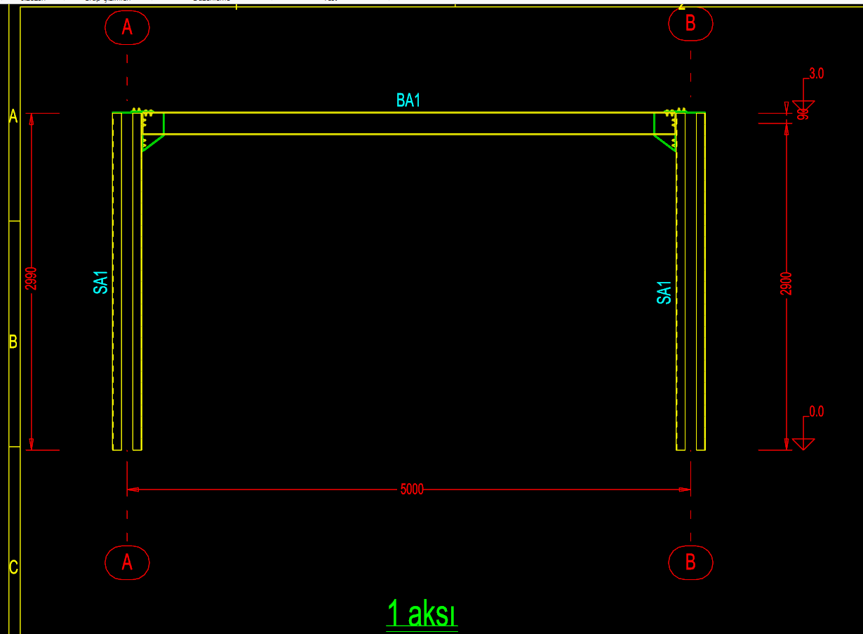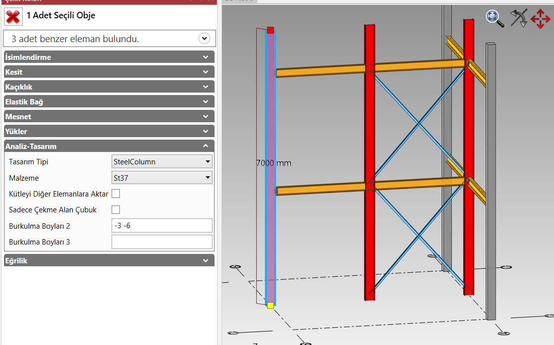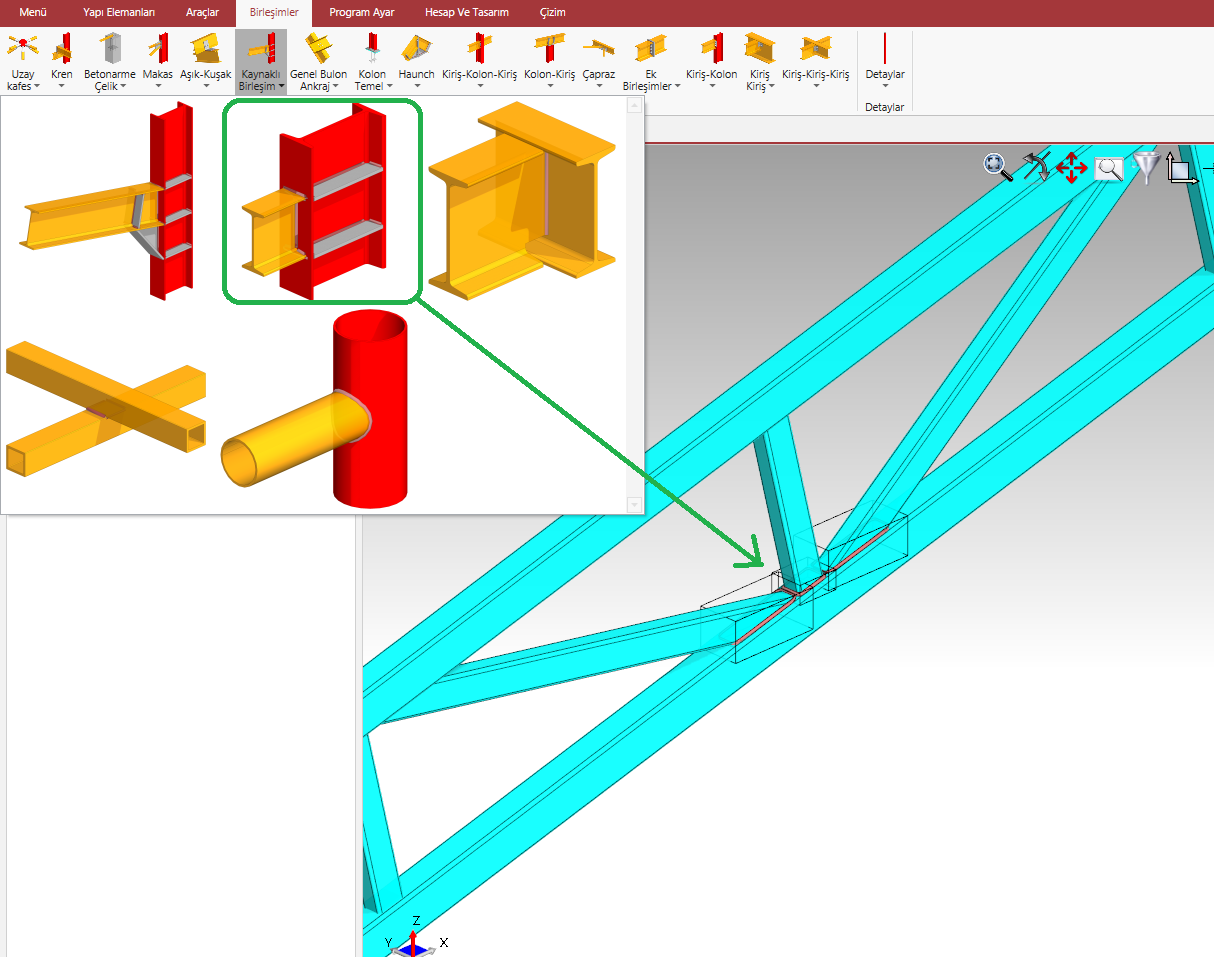 Sistemin ana kiriş ile bağlandığı noktaya biraz rijitlik verilir, çözümden sonra birleşimin kurtarıp kurtarmadığı kontrol edilir. Birleşim elemanları gelen momente göre kontrol edilmektedir: