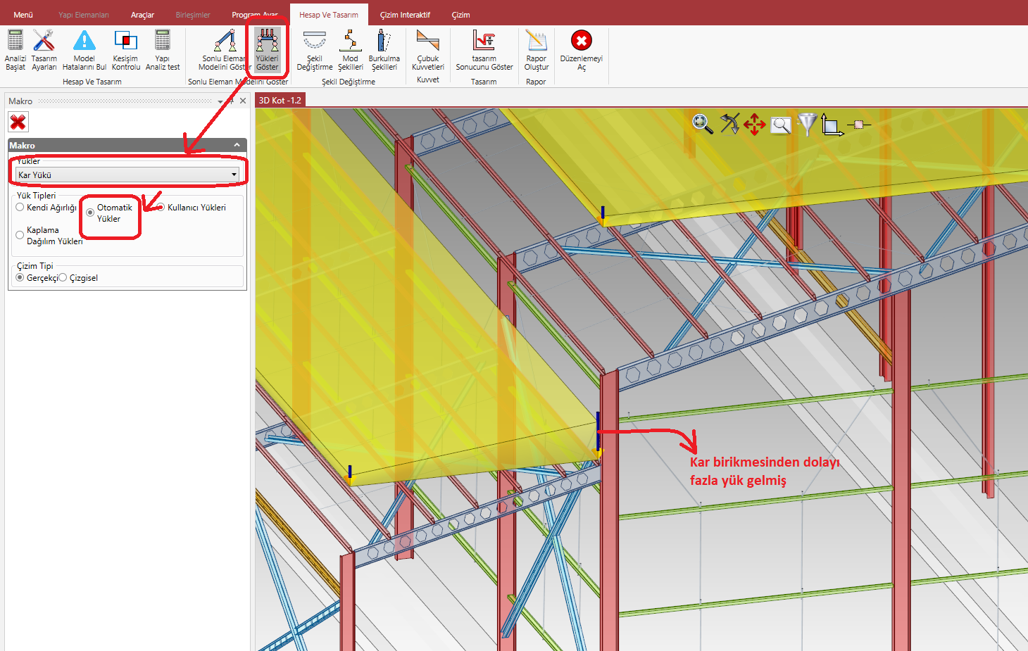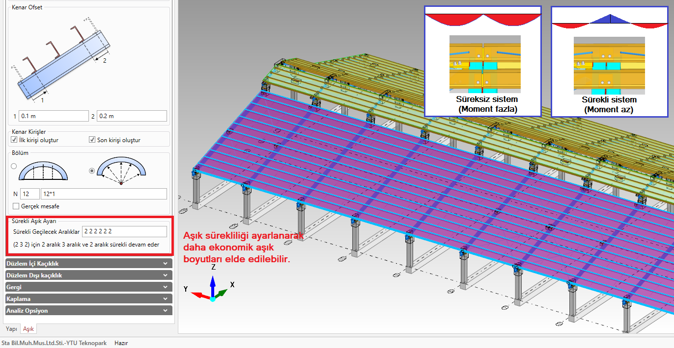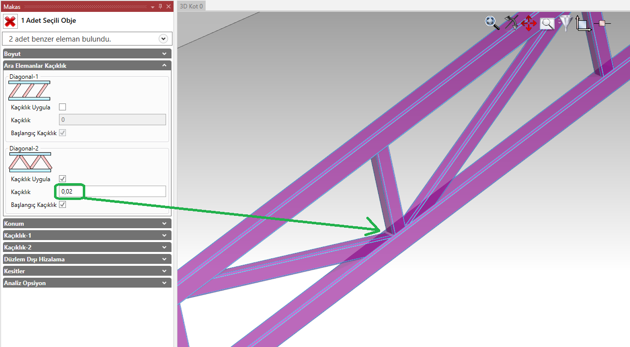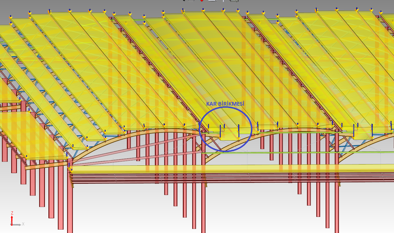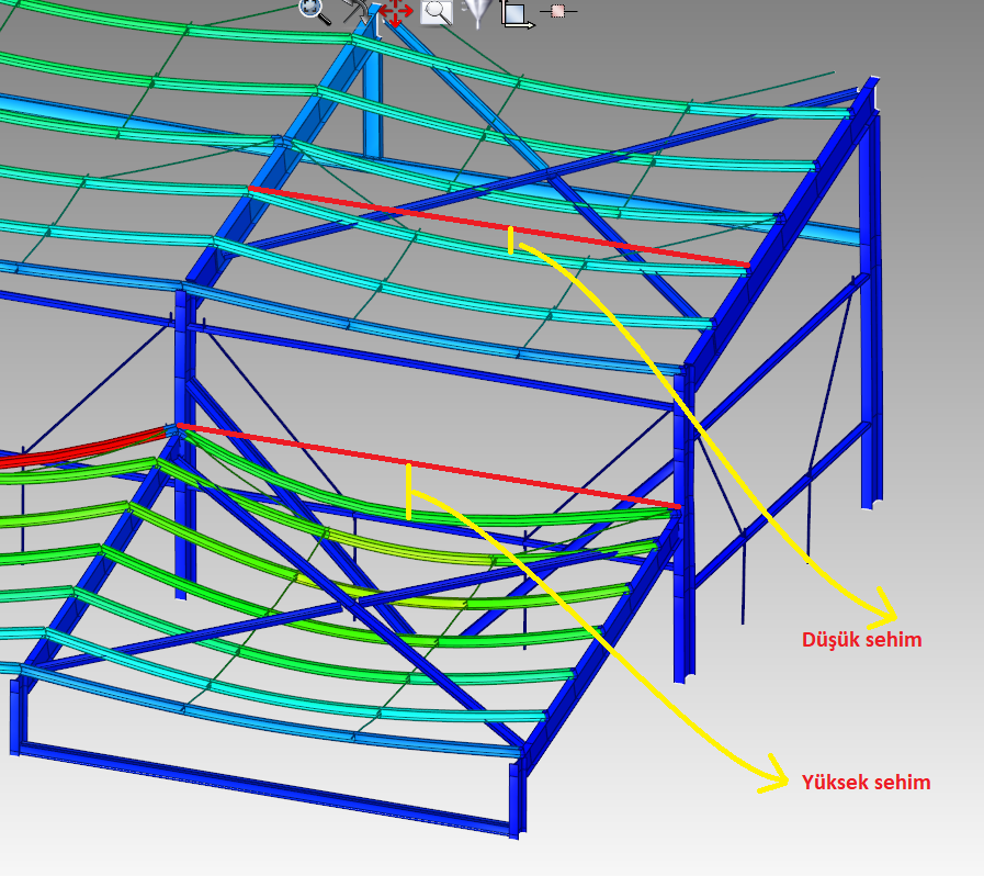 Momentin, makasın yerleşiminden kaynaklandığı görülür.Bu sistemde konsol kirişin kolonla birleştiği yerde moment aktarmayan birleşim tanımlanmış. Bu birleşim silindi ve düğüm noktasının makas ucuna alınması sağlandı. Ayrıca kirişe mafsal atanarak makasa ek moment gelmesi engellenmiştir.