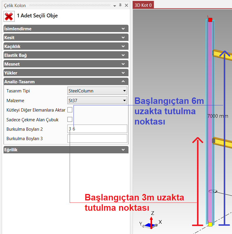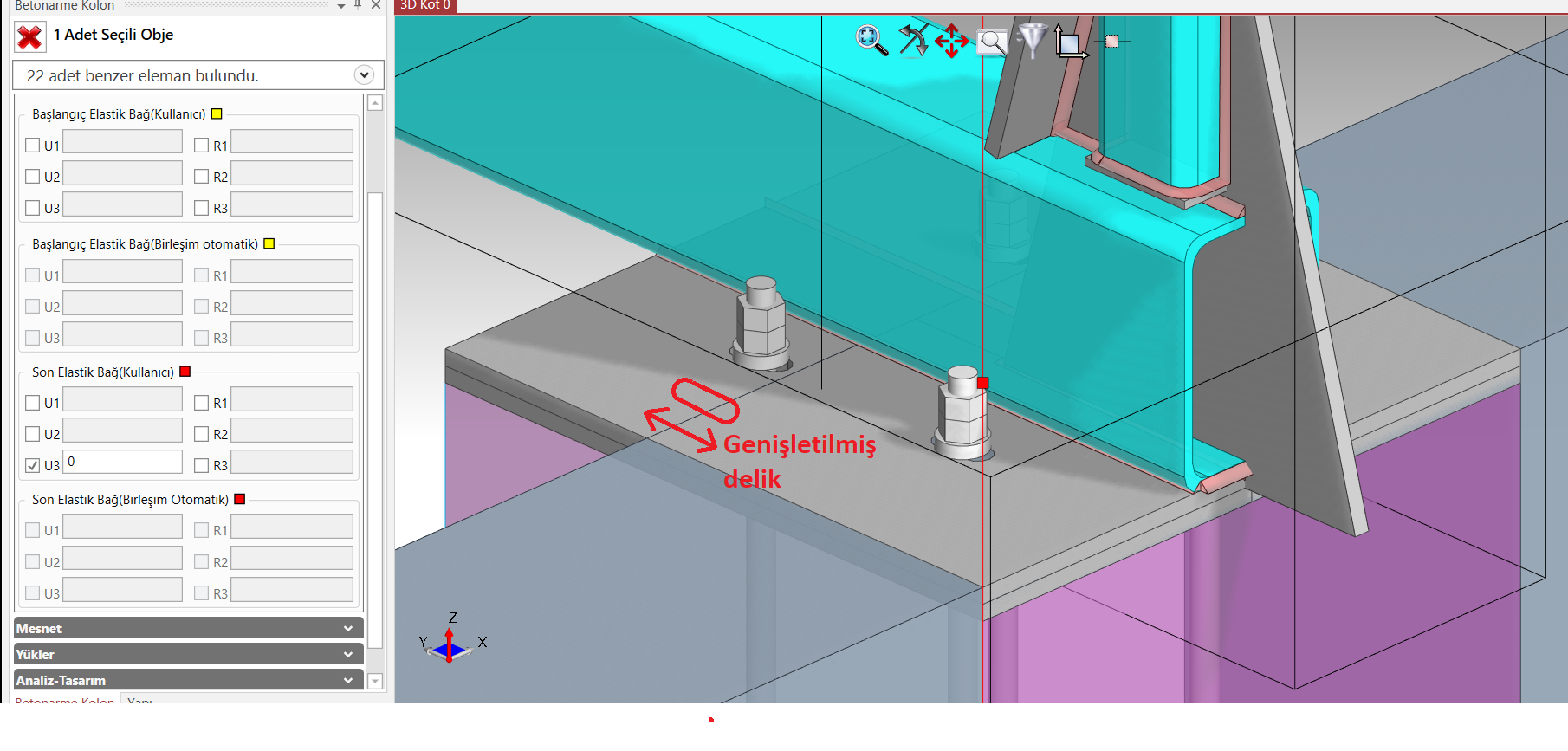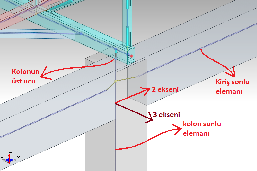 kolonun üst ucuna eklenecek "3" yönündeki kesme kuvveti mafsalı talebimizi karşılayacaktır. Burada kolonun üst düğüm noktasına herhangi bir kirişin bağlanmamış olmasına dikkat edilmelidir.