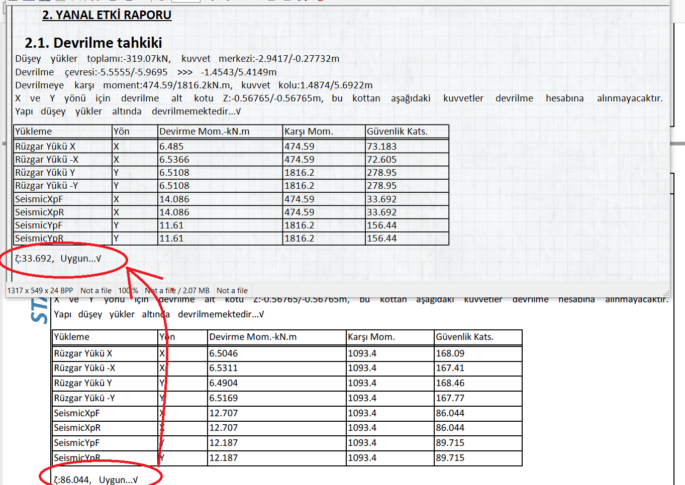 yapının devrilme güvenliği 86.044 çıkmıştır. Fakat yapı 45 derece çevrildiğinde