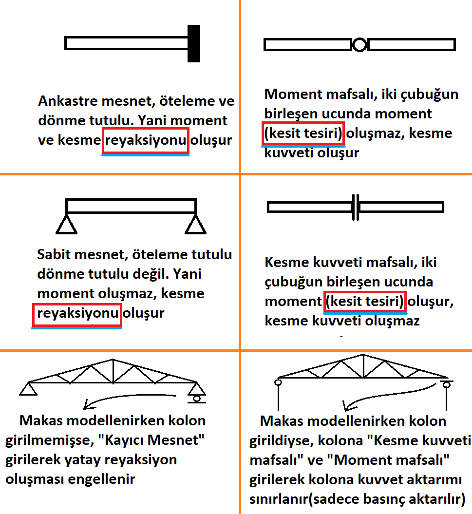 Birçok makas modellemesinde, makasın bir ucuna kayıcı mesnet eklenmek istenmektedir. Bunun için ilk olarak mesnet ve mafsalın farkını, ne olduğunu ortaya koymak gerekmektedir. Bu konuda gelen maillerde ve aldığımız telefonlarda kafa karışıklığı bulunmaktadır. Yapı statiği I konularına dönersek: