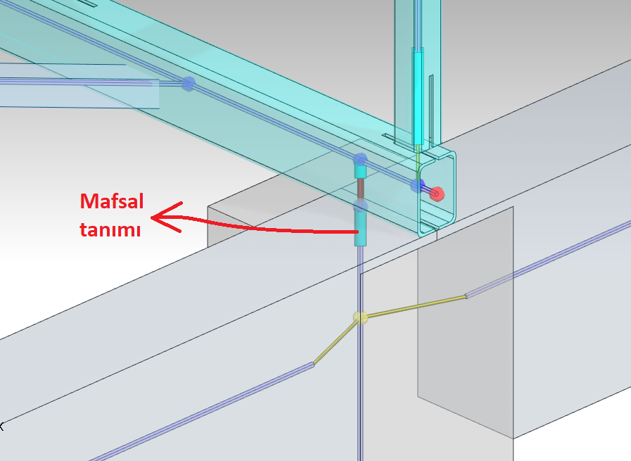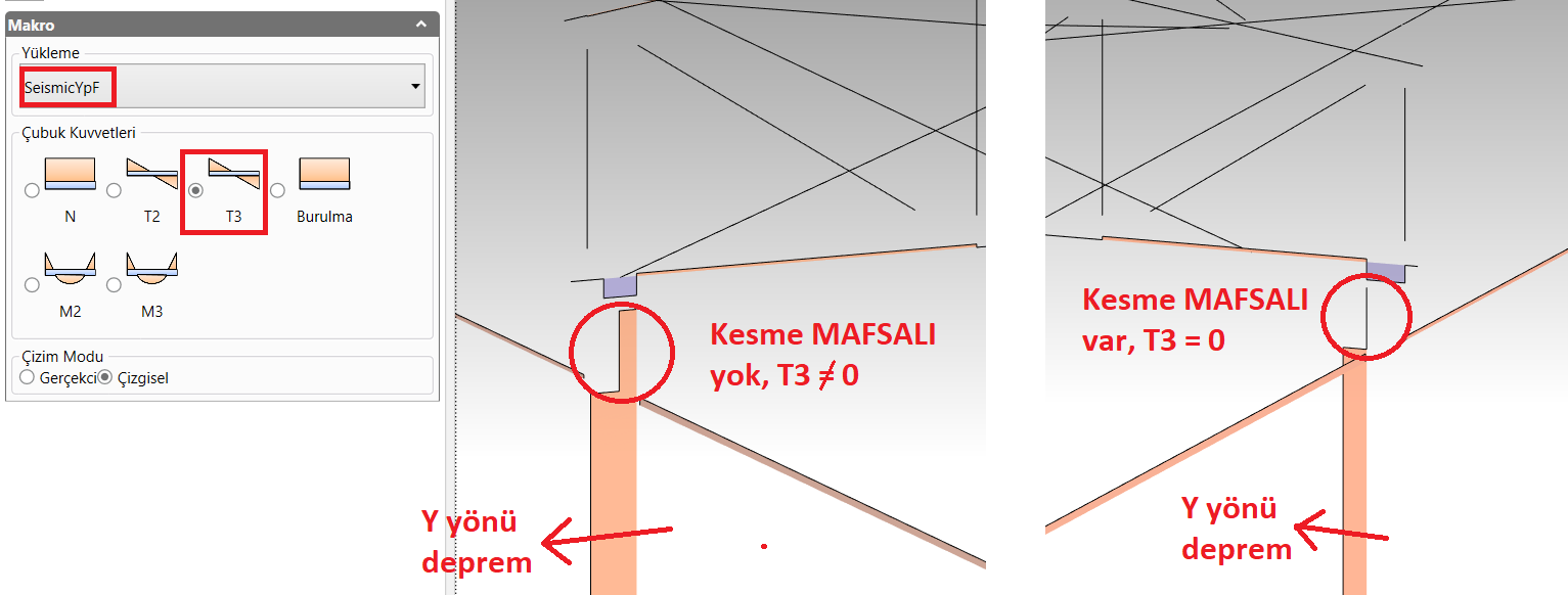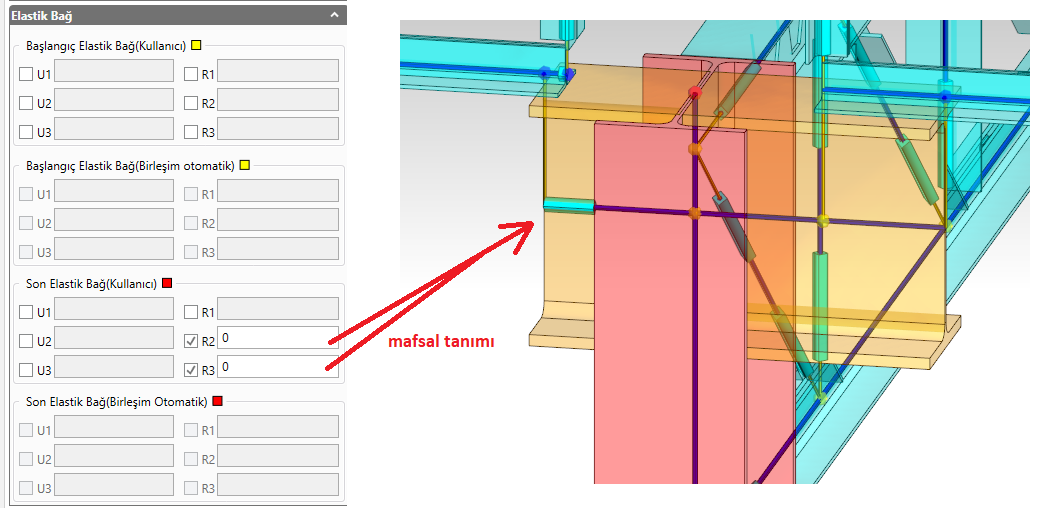 sistemde kolonlar da girildiği için MESNET değil MAFSAL kullanılmalıdır. MESNET, düğüm noktasını YER'e bağlarken MAFSAL, iki elemanın birleşiminde özel bir koşul oluşturur. Bu durumda KESME KUVVETİ MAFSALI tanımlanmalıdır.