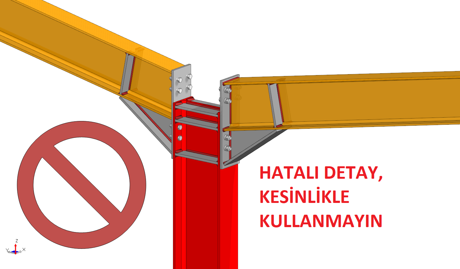 Bu detay statik açıdan çok hatalıdır. Kirişin çekme bölgesi boşta, birleşim kesinlikle moment taşımamaktadır. Uygulanması gereken guseli detay: