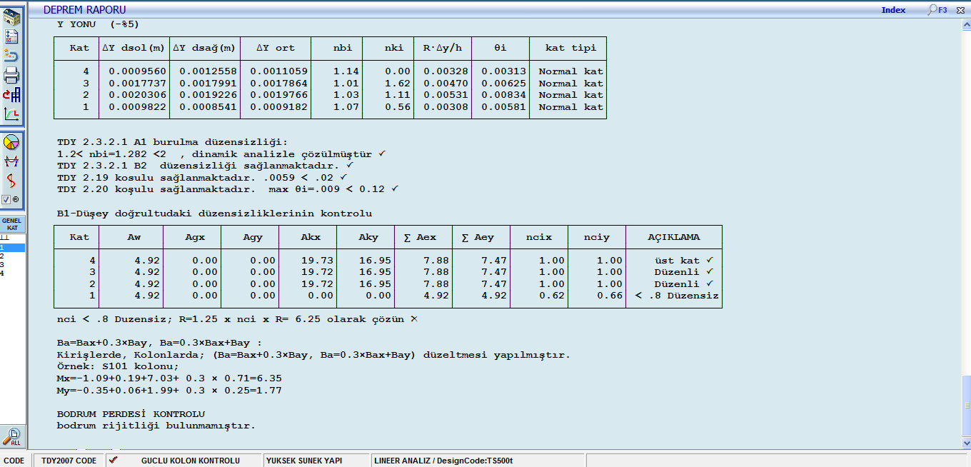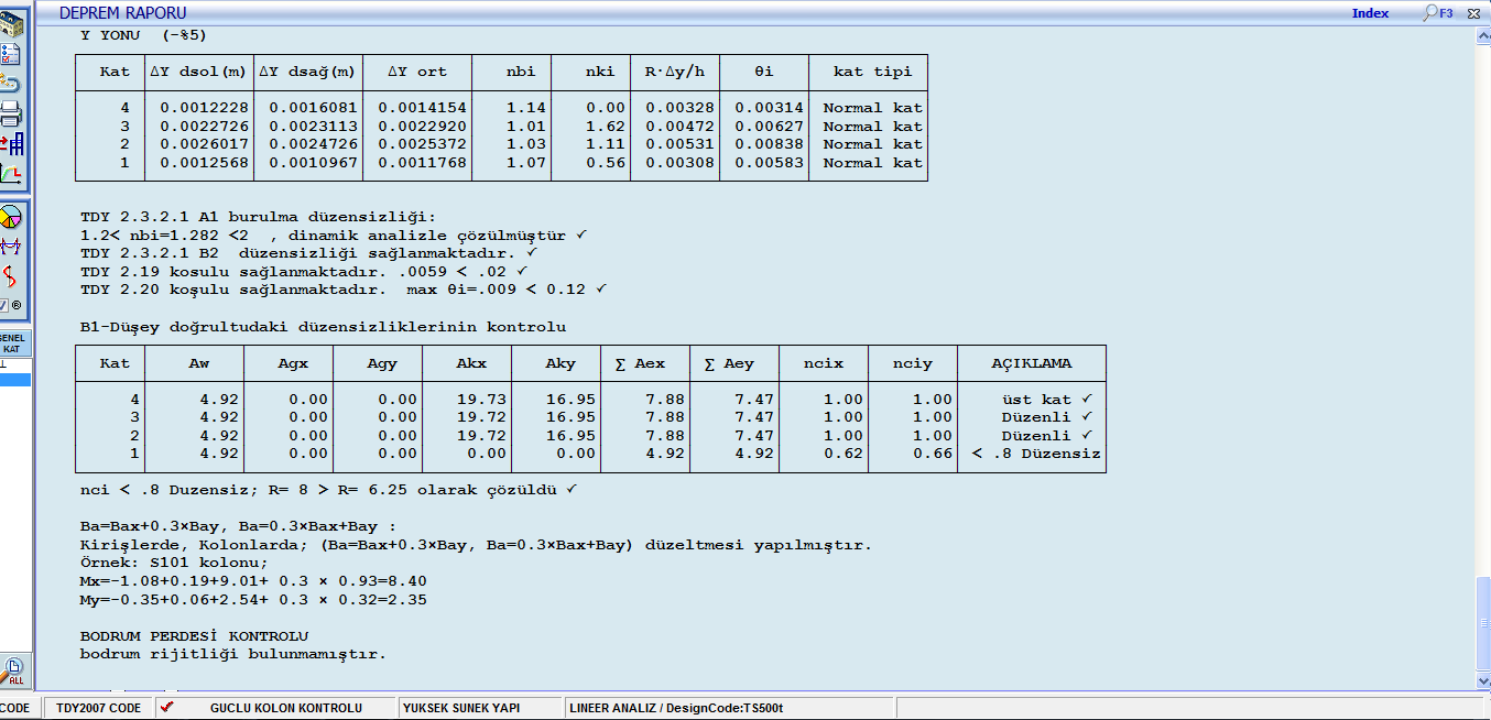 Yanlız şuna da dikkat edin, B1 düzensizliğinde tuğla duvar alanı da hesapta etkin. Bana tuğla duvarları temel üstünde tanımlamamışsınız gibi geliyor, çünkü sizin raporda 1. katta B1 düzensizliği var ve temel-1.tabliye arasındaki duvar genelde unutuluyor.