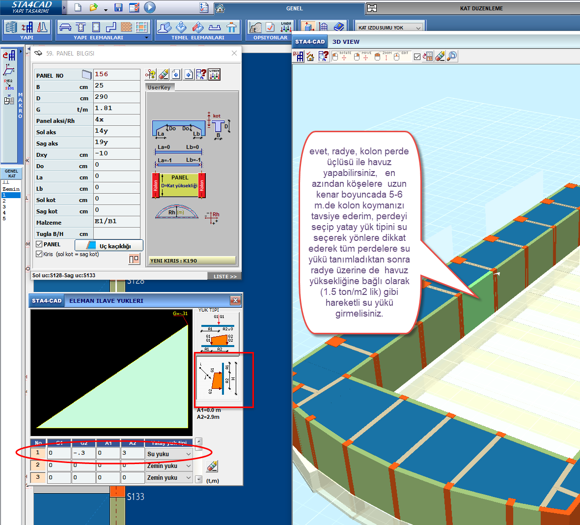 Havuz projelerinde Sta4Cad kullanımı oldukça yaygındır ve bu tür projelerde farklı tasarım yaklaşımları benimsenebilir. Genellikle, havuzun yapısına ve zeminin özelliklerine bağlı olarak en uygun yöntem seçilir. Radye plak temelli bir tasarım, özellikle zeminin taşıma kapasitesinin düşük olduğu veya deprem riskinin yüksek olduğu alanlarda tercih edilen bir yöntemdir. Bu yöntem, havuzun ağırlığını daha geniş bir alana dağıtarak zemin üzerindeki baskıyı azaltır ve yapısal stabilite sağlar.
