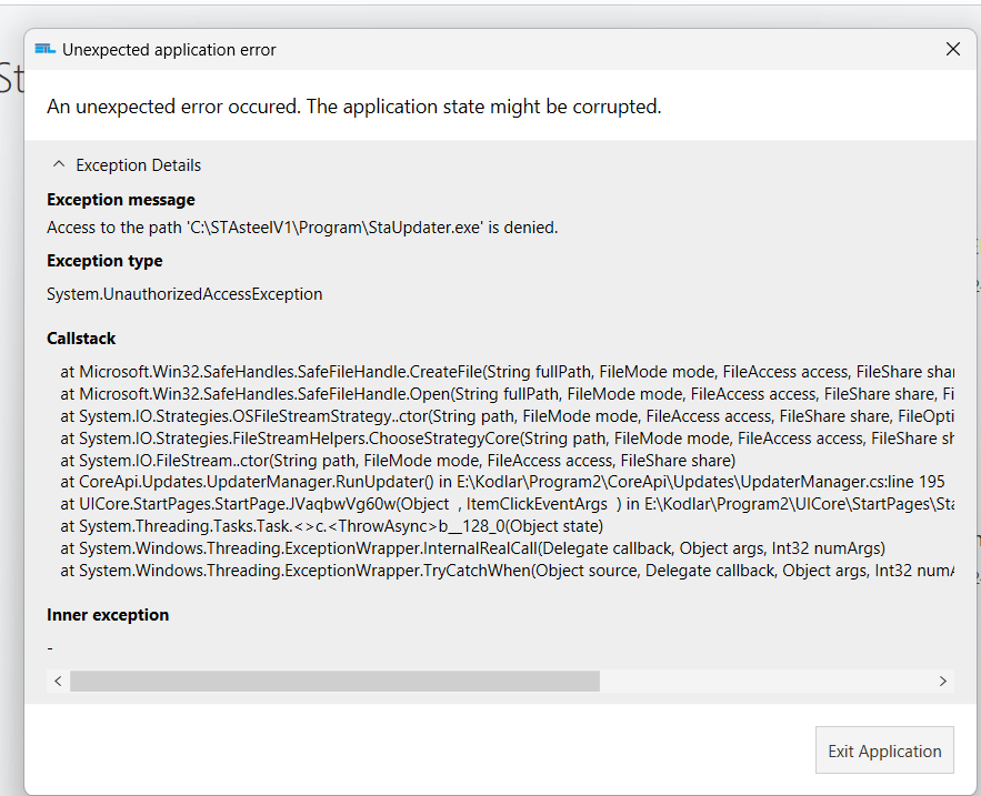 C:\STAsteelV1\Program klasörüne programın dosya kaydetmesini engelleyen bir sorun var dosya izinlerini kontrol edin.