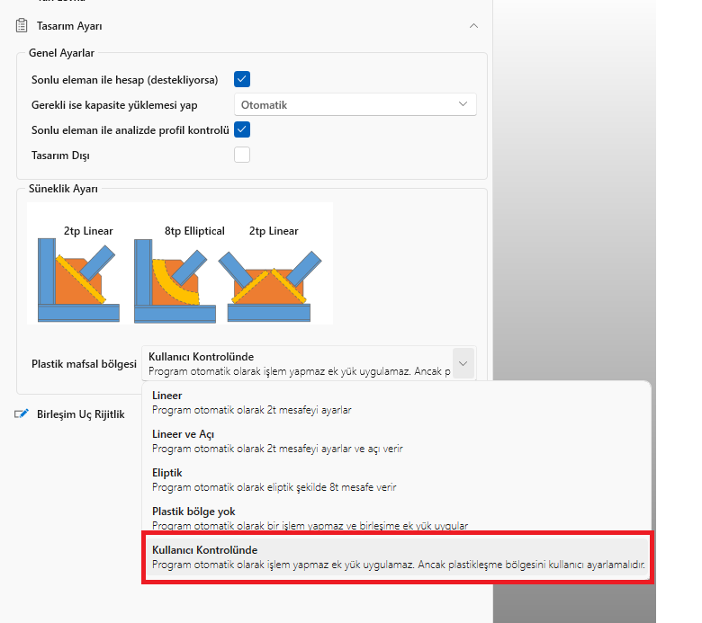 6) User-defined options have been added to the automatic plasticization zone creation options in brace plates. When this option is selected, the program does not perform a capacity calculation in the joint, but the user is responsible for creating gaps such as 2t. When this option is selected, the program does not perform a capacity load and does not give a warning.